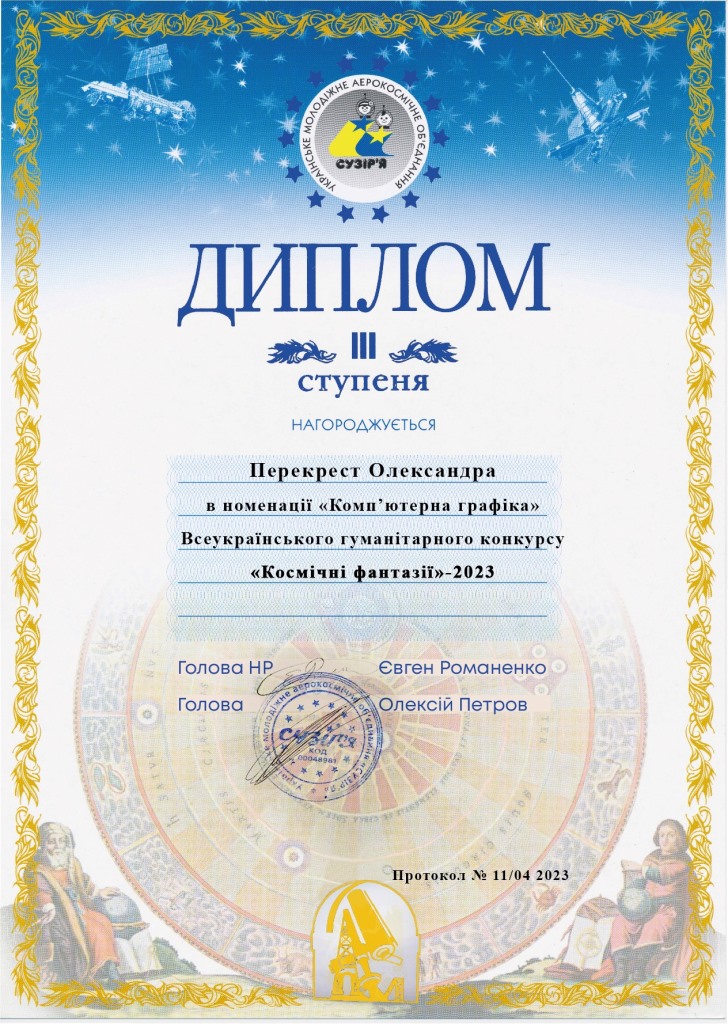 За глибоку уяву, світогляд, ідейний зміст та майстерність в номінації «Комп'ютерна графіка» дипломами УМАКО «Сузір'я» нагороджено вихованок гуртка "Веселкова палітра" Данилюк Марину, Дмитрук Аню, Перекрест Сашу. Вітаємо!